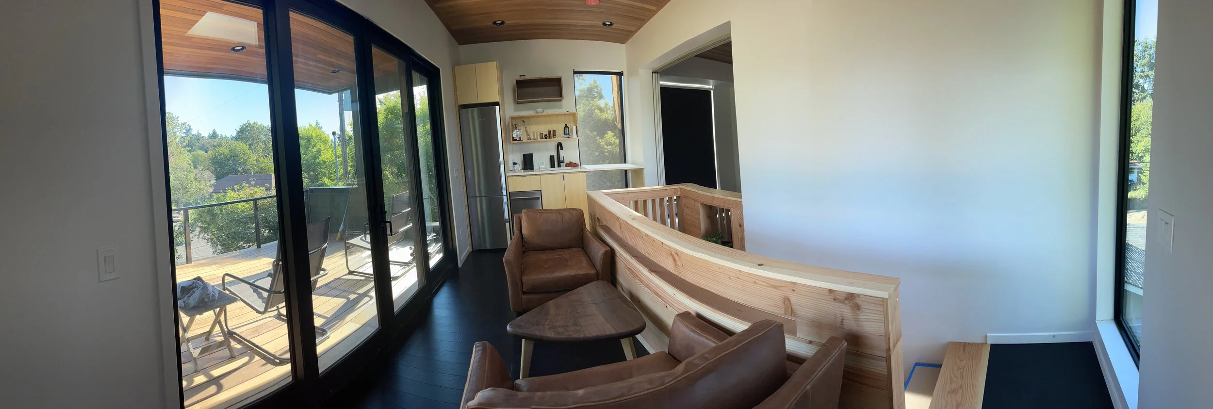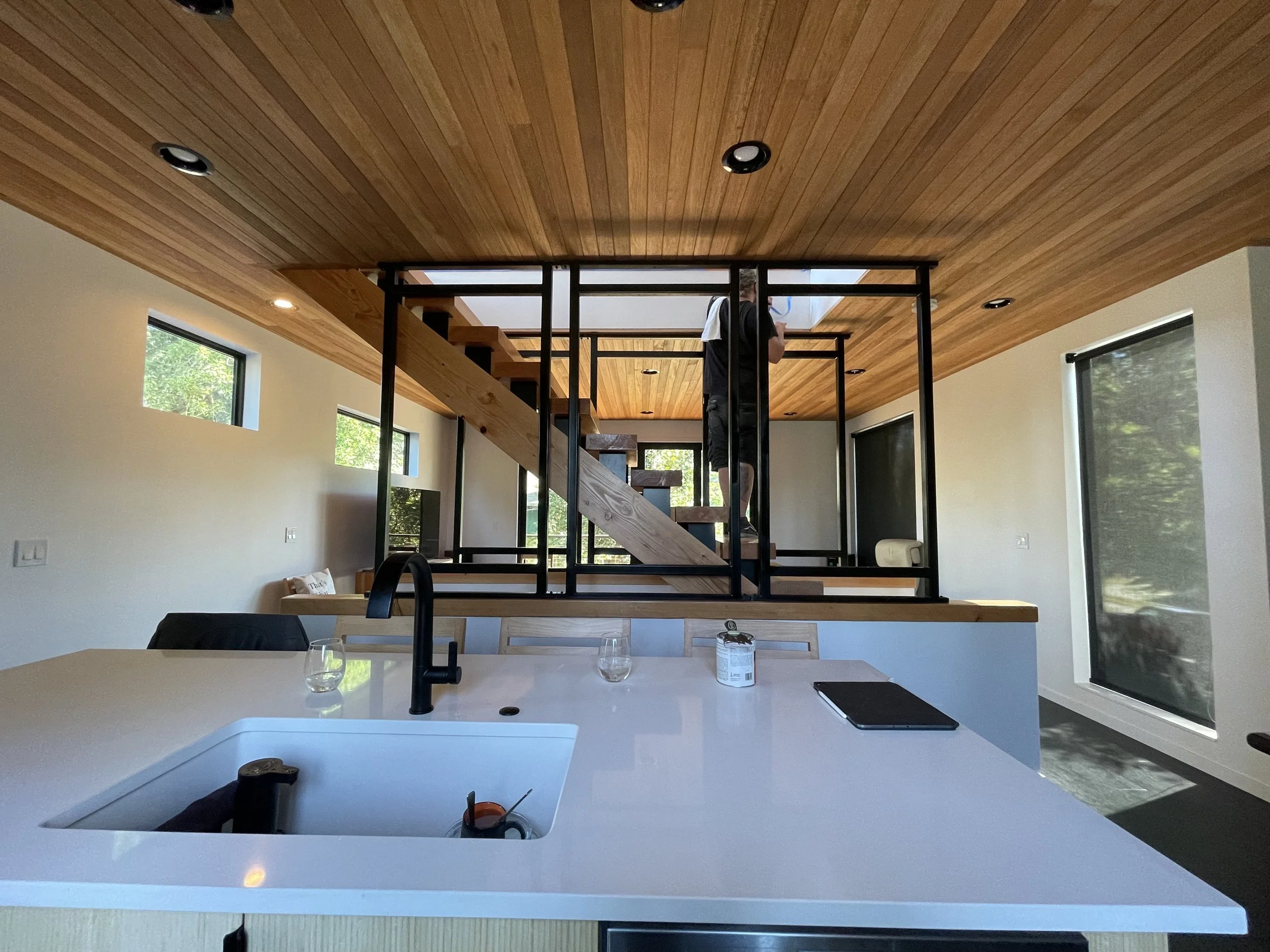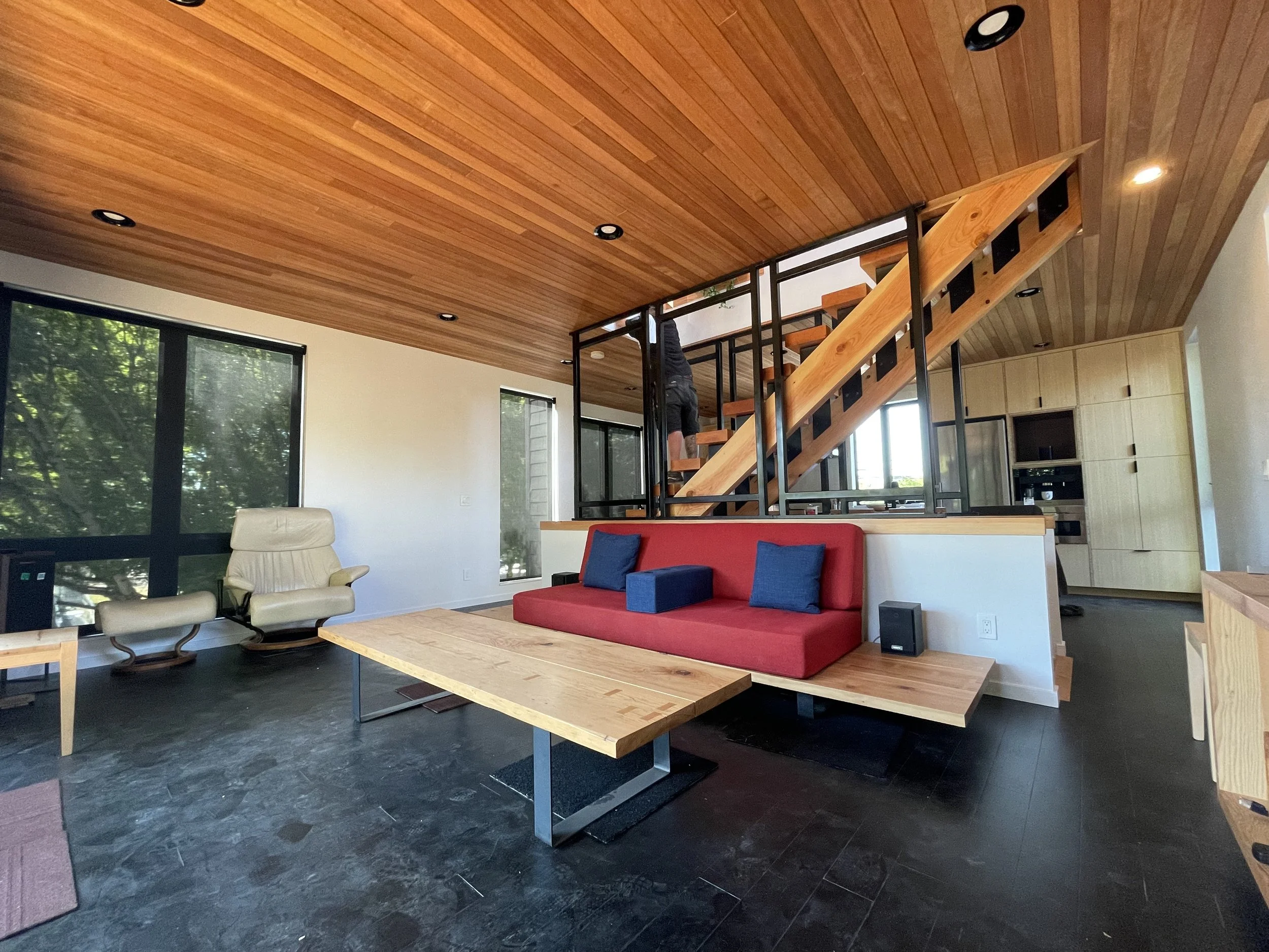 in the kitchen looking south past the stair, in to the living room and out to the second level deck.
