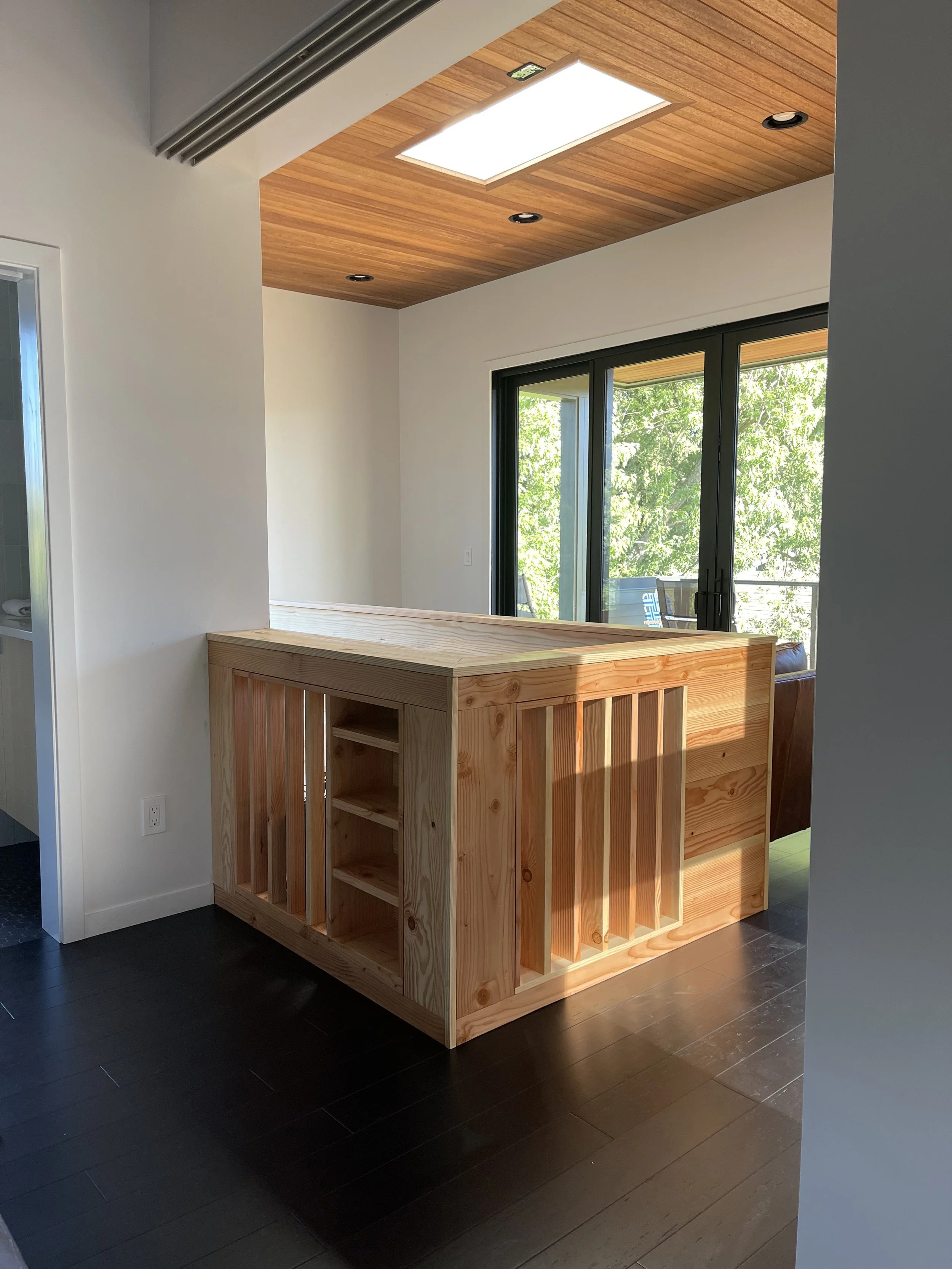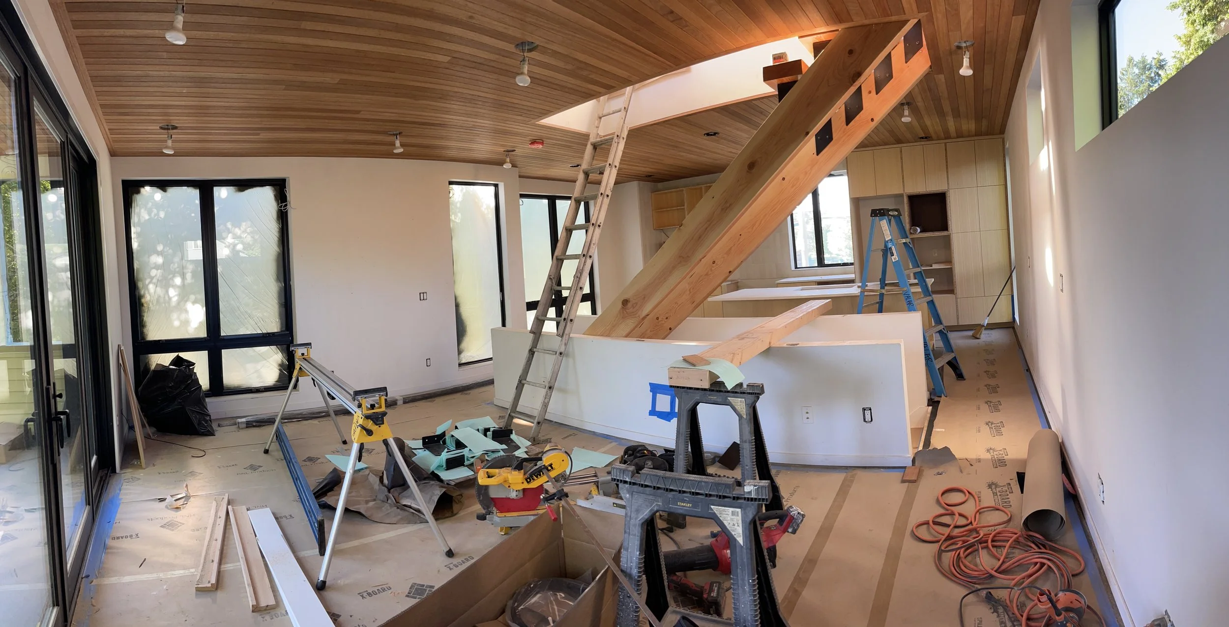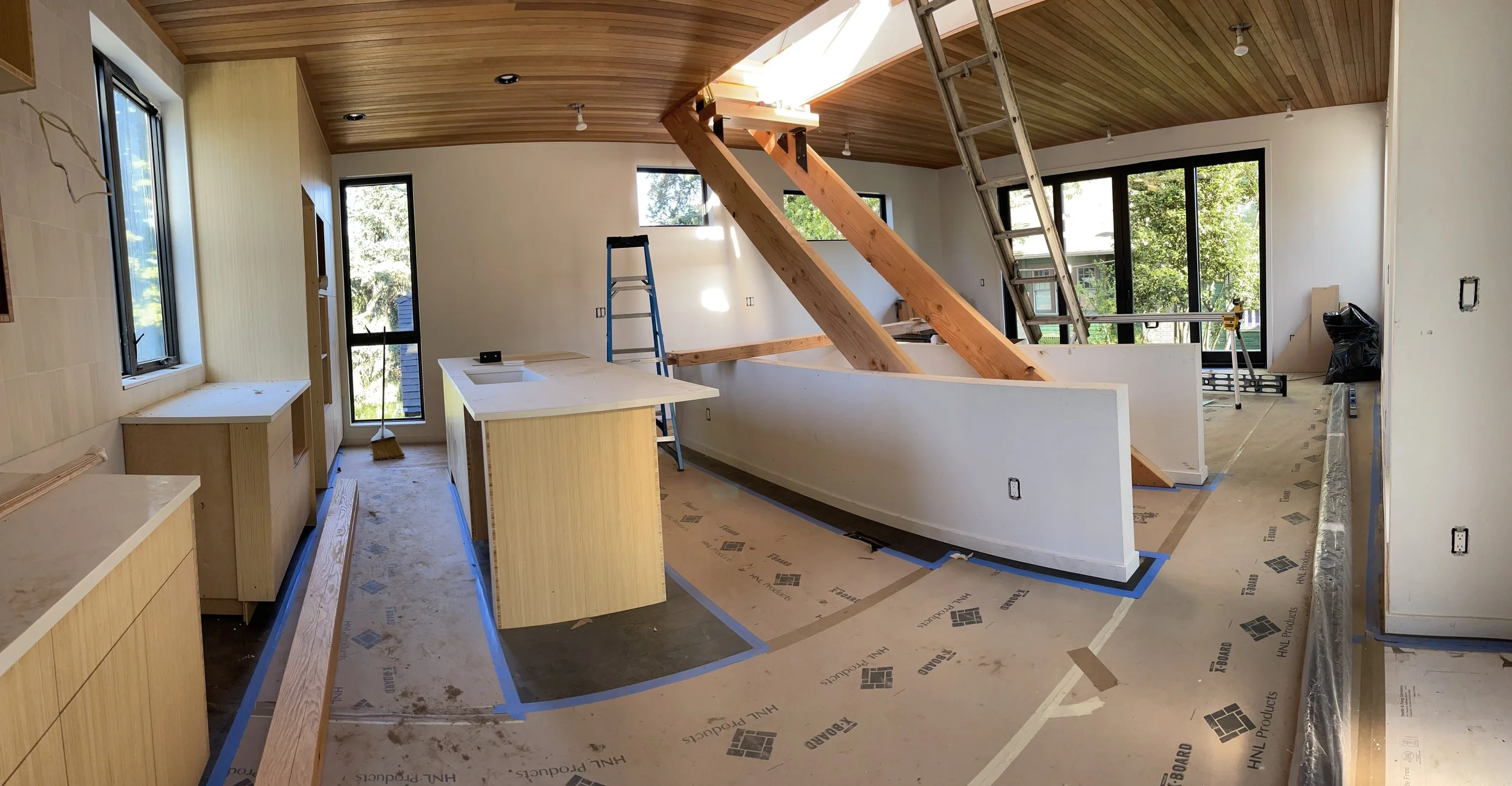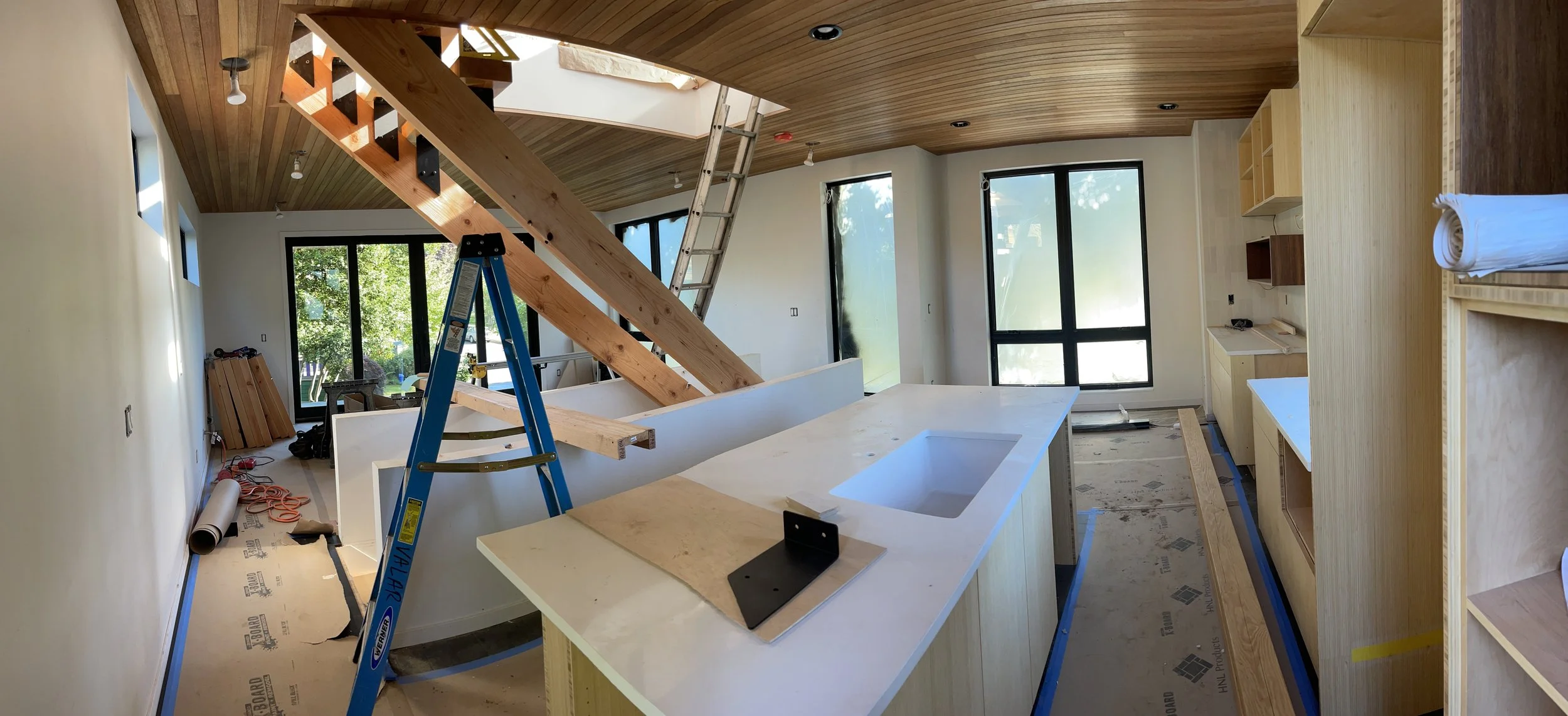 in the kitchen looking south past the stair, in to the living room and out to the second level deck.